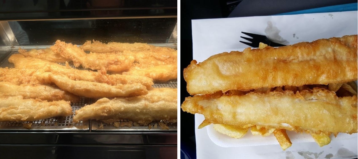 Excellent sized portion of chips especially as English chippers tend to be on the smaller size portion. The Irish curry sauce is fantastic. The cod was a good size and tasted fresh. The staff are very polite and happy. They do accept card which is helpful however use cash where possible . Very good value for money.